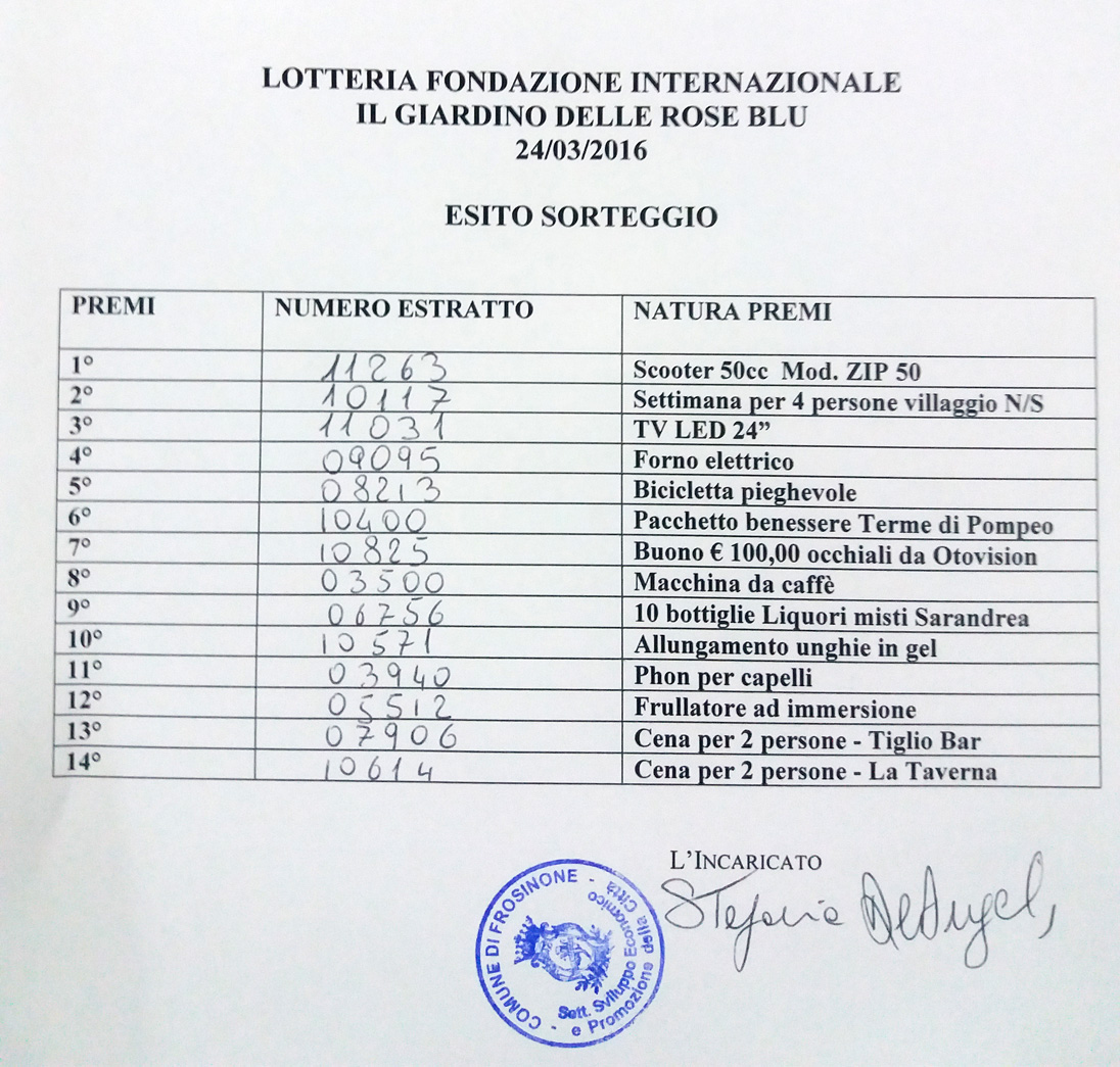 Come tutti sapete la nostra Fondazione ha messo in piedi una lotteria di beneficenza grazie all’ufficio found raising della Fondazione stessa capitanato dall’instancabile volontaria Franca Belli che da un anno sostiene le attività di raccolta fondi della segreteria. Nel ringraziare i vari sponsor e tutti i volontari che hanno collaborato alla vendita dei biglietti siamo lieti con questo articolo di comunicare i numeri dei biglietti vincenti che riportiamo di seguito.